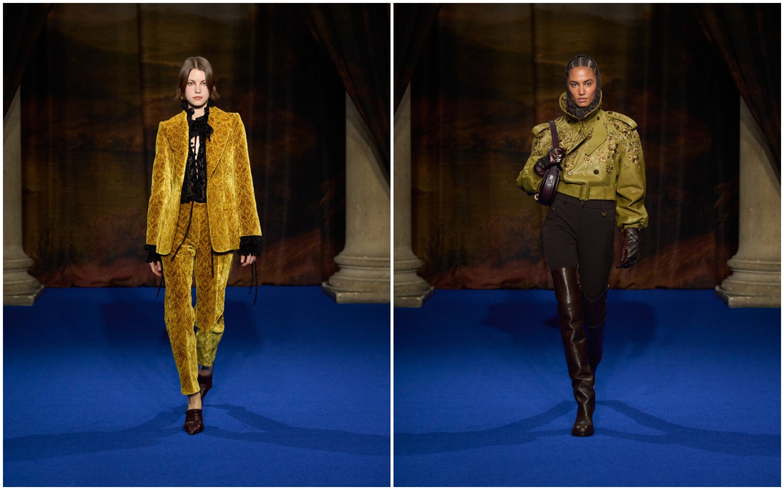色彩選擇上,本季時裝系列呼應壁毯背景,延伸出鹿皮棕、森林綠、石牆灰、深紅與金黃等大地色調,形成一種貼近自然卻不失典雅的調性。Burberry 品牌創意總監 Daniel Lee 表示,此次佈展靈感來自於英國人於週末的出城旅行:雨中漫步、莊園探訪,以及「從倫敦出走」的脫逃感。這次場地選在泰特不列顛美術館更具雙重意義,這裡既是英國藝術殿堂,也跟 Burberry 將支持美術館的藝術品修復計畫有關。