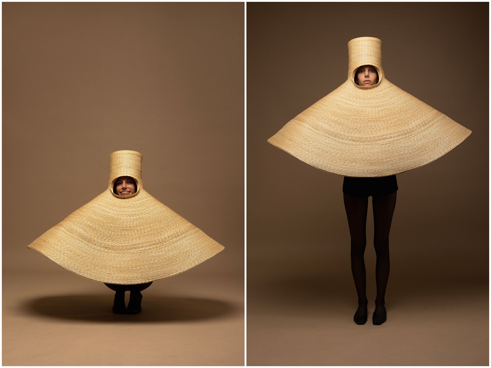Chaude Couture 覆蓋了穿戴者的上半身,圓筒狀的帽型貼合頭部,卻一點也不笨重,然後它的防雨關鍵在於材料:整件雨衣是由手工編織的稻草製成,纖維具有天然的防水性,雨水會順著外層流下,不會滲進衣服裡。這件雨衣由 Giulia Pozzi 與 Mirko Andolina 所創立的 Fabulism 所設計,並找來熟練的工藝師,把稻草編成服飾結構,成果彷彿是傳統斗笠和現代外套的融合,既呼應前人智慧又時尚新潮。