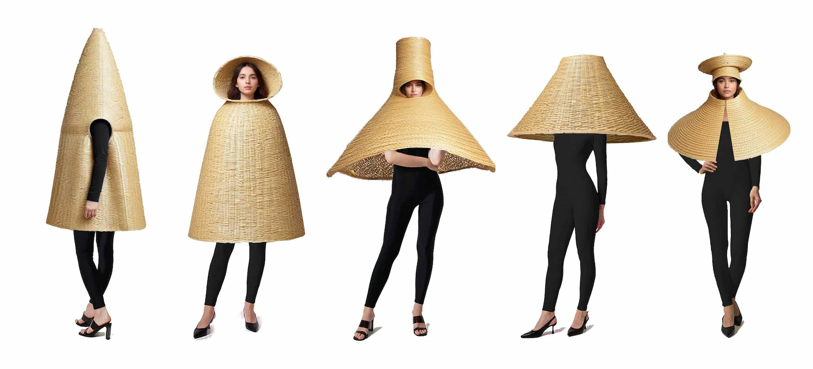 Chaude Couture 的靈感來自傳統雨衣的形式,尤其是那些來自東亞與熱帶地區的設計,比方 Fabulism 團隊就在研究中發現,越南、中國、日本等多雨的地方,早在幾百年前,人們就懂得利用稻草、棕櫚等植物纖維做出防水衣物,像台灣以前農家常見的蓑衣,就是其中一種。