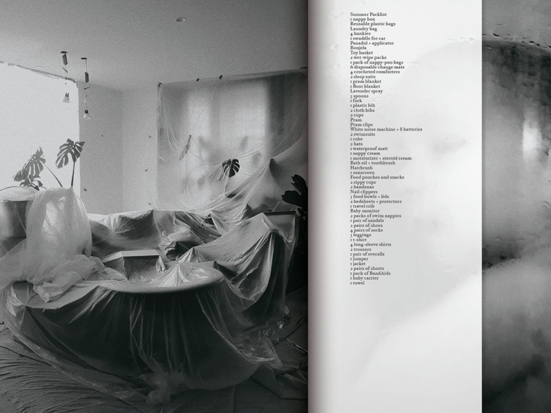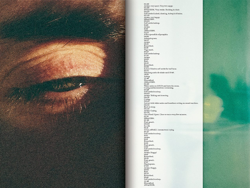 半掩的月光、垂墜的花朵、結著果的樹枝,胎兒的超音波、嬰兒的夜視畫面、疲憊的精神狀態、嬰兒裹被、光線下的奶瓶、窗外的日落、洗澡時間,頁面間不時還穿插孔版印刷文字,行行條列的逃避念頭(固然是想像)⋯⋯ 你會發現,在《The Quickening》這個系列作裡,不是窺視視角下的私密記錄,而是平視的捕捉。