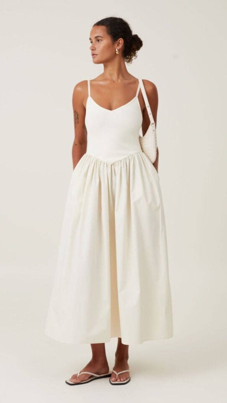 想要精心在對方腦海中留下怦然心跳的畫面,但又不想顯得太過刻意、做作,那麽是時候拿出衣櫃中那件細肩或削肩連身裙了,素色配色看來簡約無害,無論是 A 字下擺或是直版剪裁,視覺隨著手臂與肩膀線條帶出自信的性感。材質上,棉麻或絲質洋裝非常適合夏日夜晚,若是擔心因為穿梭室內外的溫差感到不適,點綴一件薄款小外套當作披肩或腰部裝飾,最後一腳穿上露趾涼鞋、背上單肩包,妳已經準備好美美地赴約了!