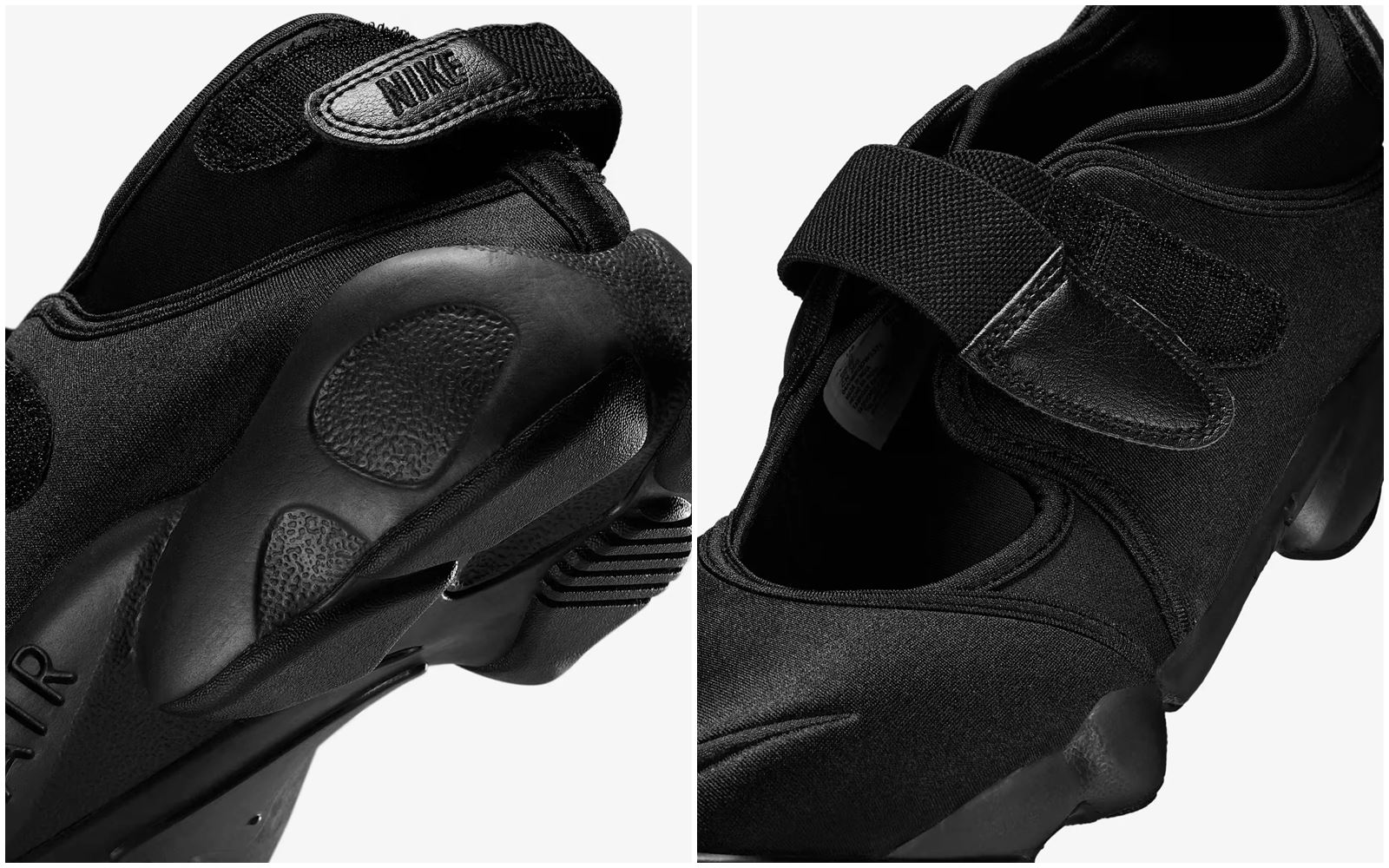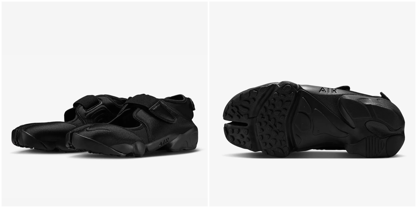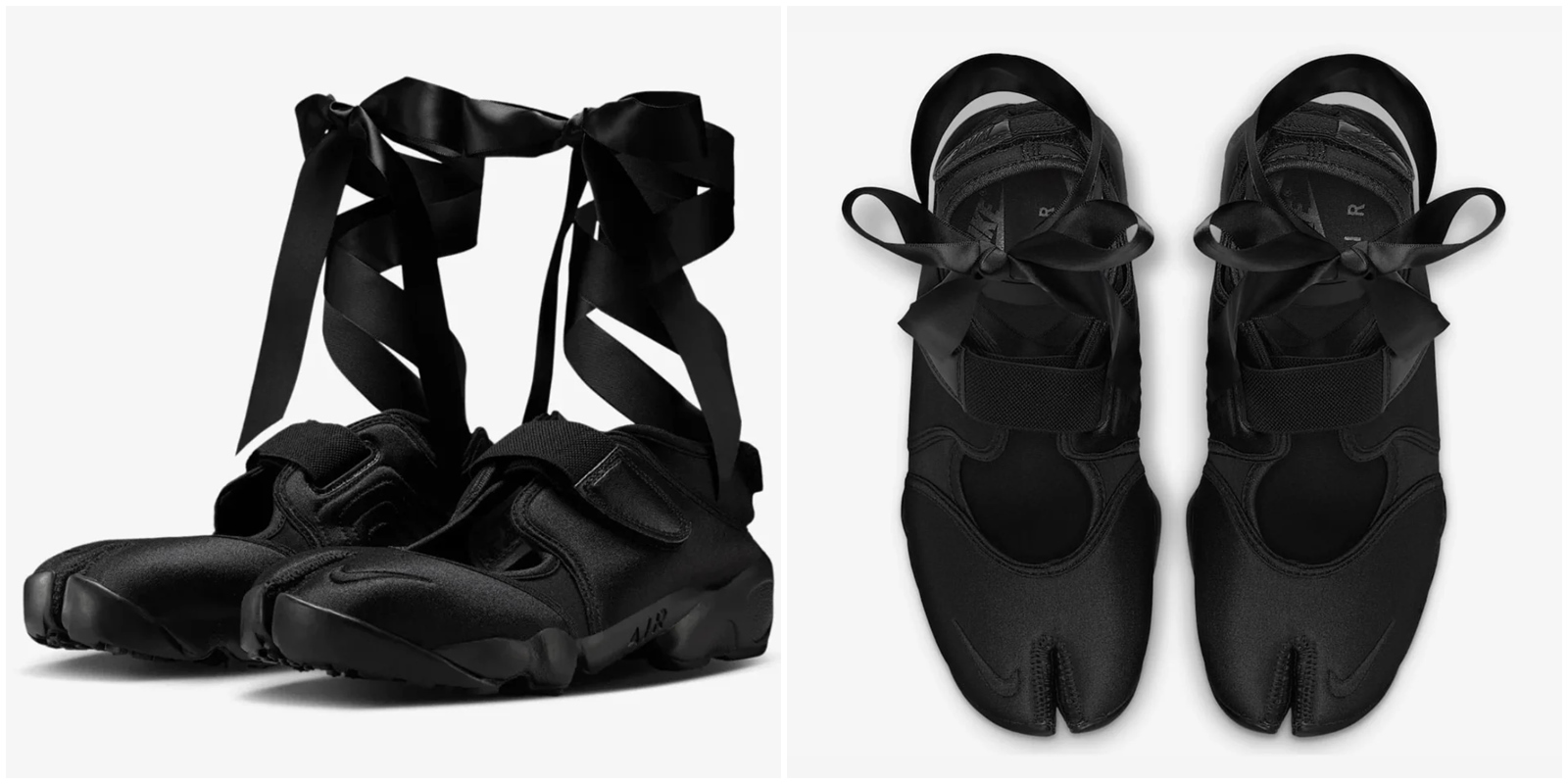 Nike 推出的 Air Rift Black Swan 鞋款,則選擇強烈的黑色演繹芭蕾元素,但整體性格不走柔美路線,反而帶有一絲叛逆的暗黑詩意。此鞋款延續 Air Rift 標誌性的分趾結構、柔韌的網眼與氯丁橡膠鞋面,並加上可自由纏繞於腳踝的長版緞帶設計,表現如芭蕾舞鞋般的綁帶形式。更棒的是,它的中足和後跟都搭配魔鬼氈固定帶,並配備輕盈的 Phylon 中底跟耐磨橡膠大底,確保日常步履既典雅又穩健。