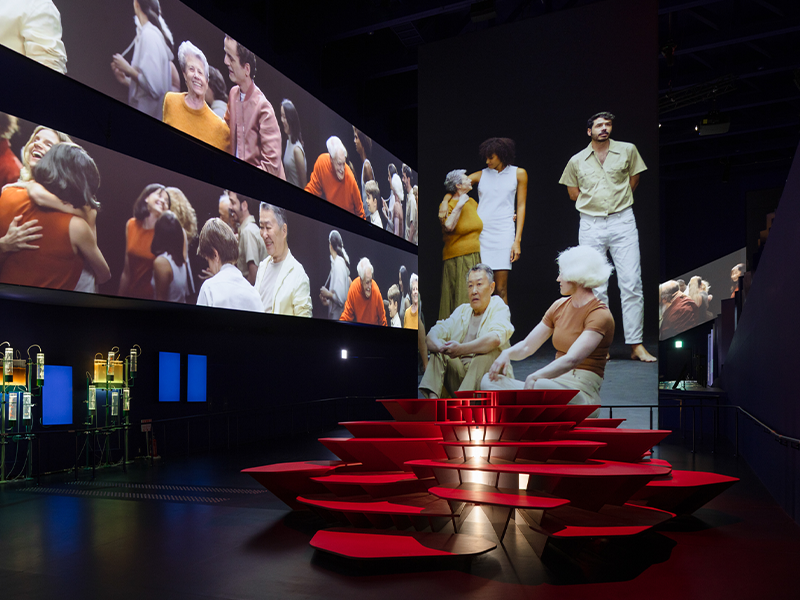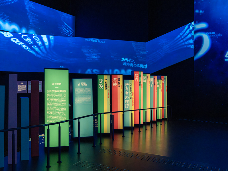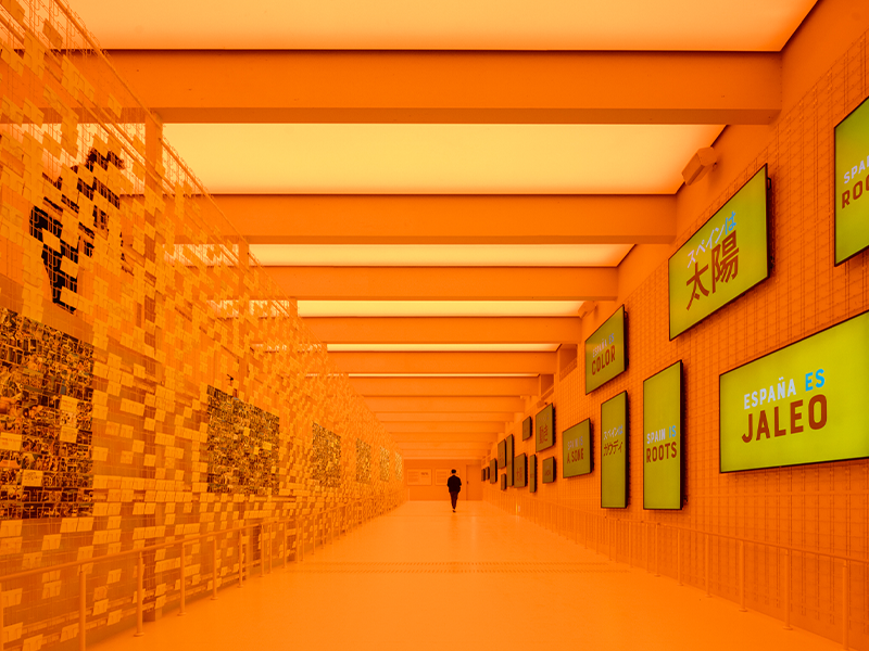 展區首先走訪歷史的脈絡,再透過大規模投影、聲音裝置與互動媒材模擬海洋的律動節奏,向未來想像區無垠延展。在行進間,人們能感知海洋生物的多樣性、理解藍色經濟的潛力,並反思氣候變遷所帶來的環境挑戰;最後再進入充滿熱情氣息的橘色沙灘空間,明亮溫煦的空間充盈來自西班牙的問候,以及一幀幀旅遊照片組成的牆面,呈現這個南歐國度的熱情燦爛與觀光風光。