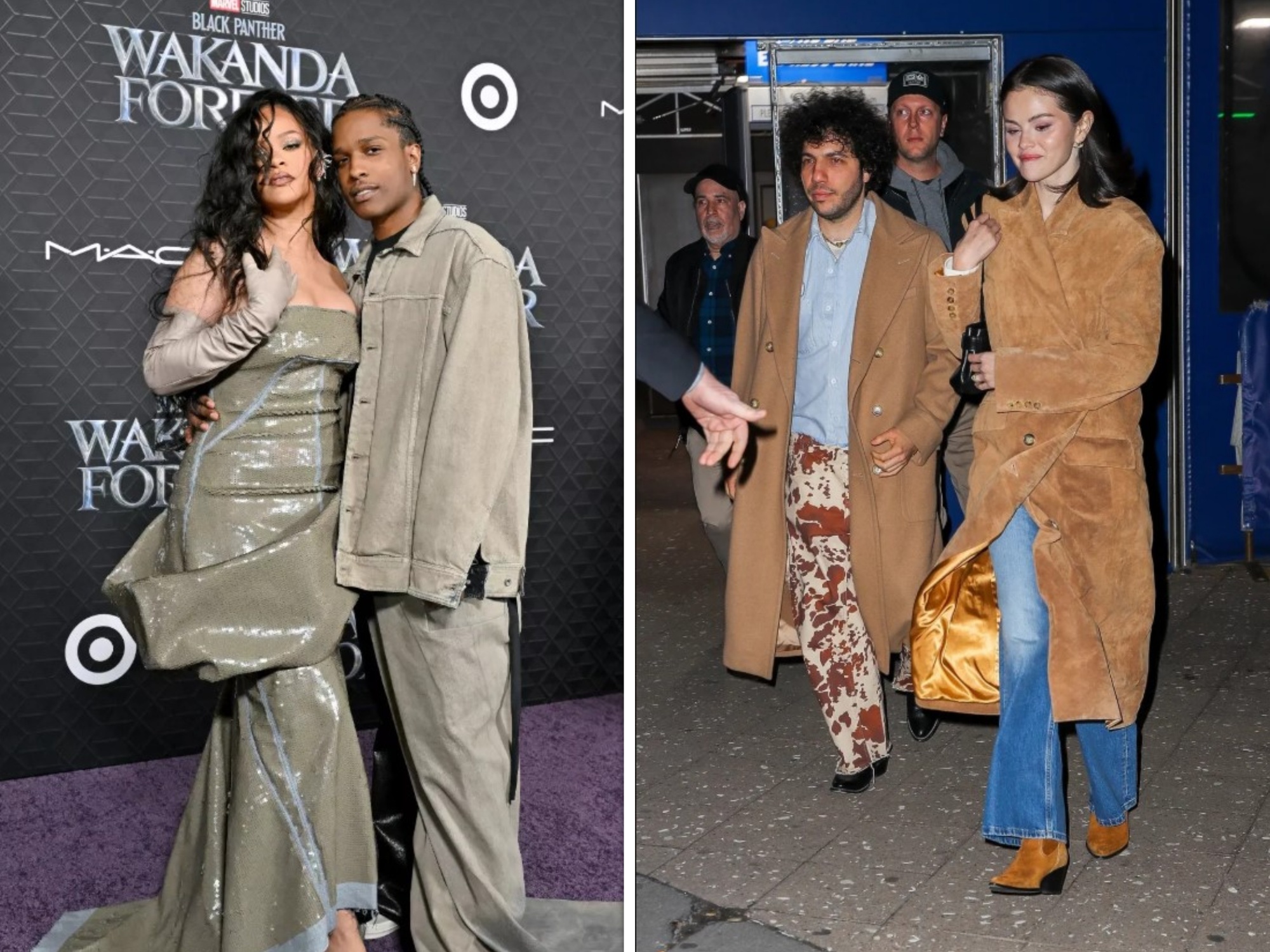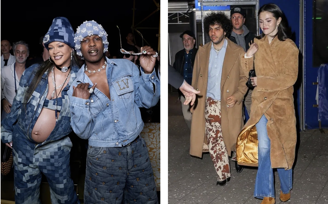 看看這組酒紅調的搭配,Zendaya 的 V 領皮裙映襯 Tom Holland 同色上衣,一個小露個性性感、一個散發穩重而彬彬有禮的氣息,充滿舒心質感; Rihanna 和 A$AP Rocky 則把丹寧元素結合珍珠與銀鍊細節,把街頭感搭配得像愛情電影;Selena Gomez 和 Benny Blanco 的西部風格則翻玩得既粗獷又柔軟 ⋯⋯ 這些雙雙對對的儷人們,選擇將默契藏在細節裡,流露一種不約而同的親密感。