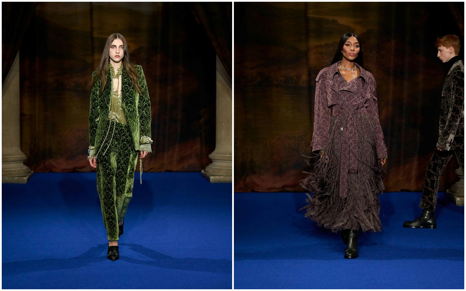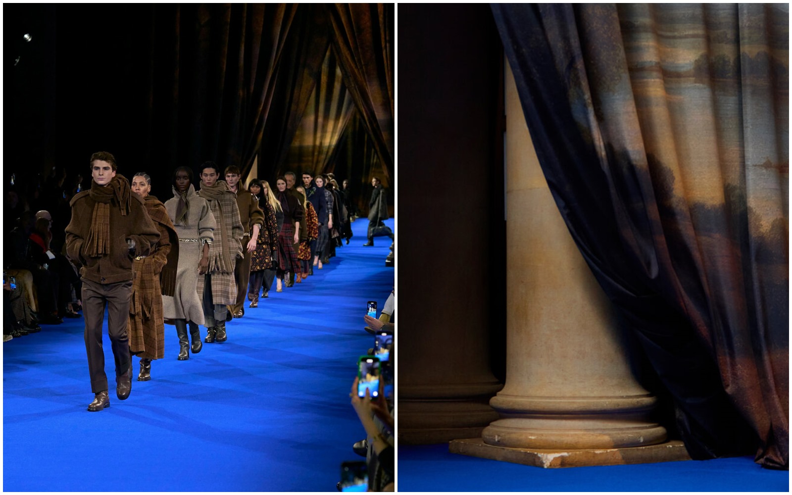 這次 Burberry 的舞台設計以「褪色的華麗」為核心,Bureau Betak 重新演繹英國大師的風景畫與壁毯,將其轉化為帶有舊日莊園氣息的背景裝飾,而模特兒穿梭於泛黃的鄉間畫卷之間,讓與會者彷彿瞬間成為歐洲貴族,體會那些消逝的往昔風華。這種特殊的舞台處理方式,不只回應了品牌的英國基因,更凸顯出一種時間的質感,提醒我們時尚與文化記憶一樣,值得被保存及再現。