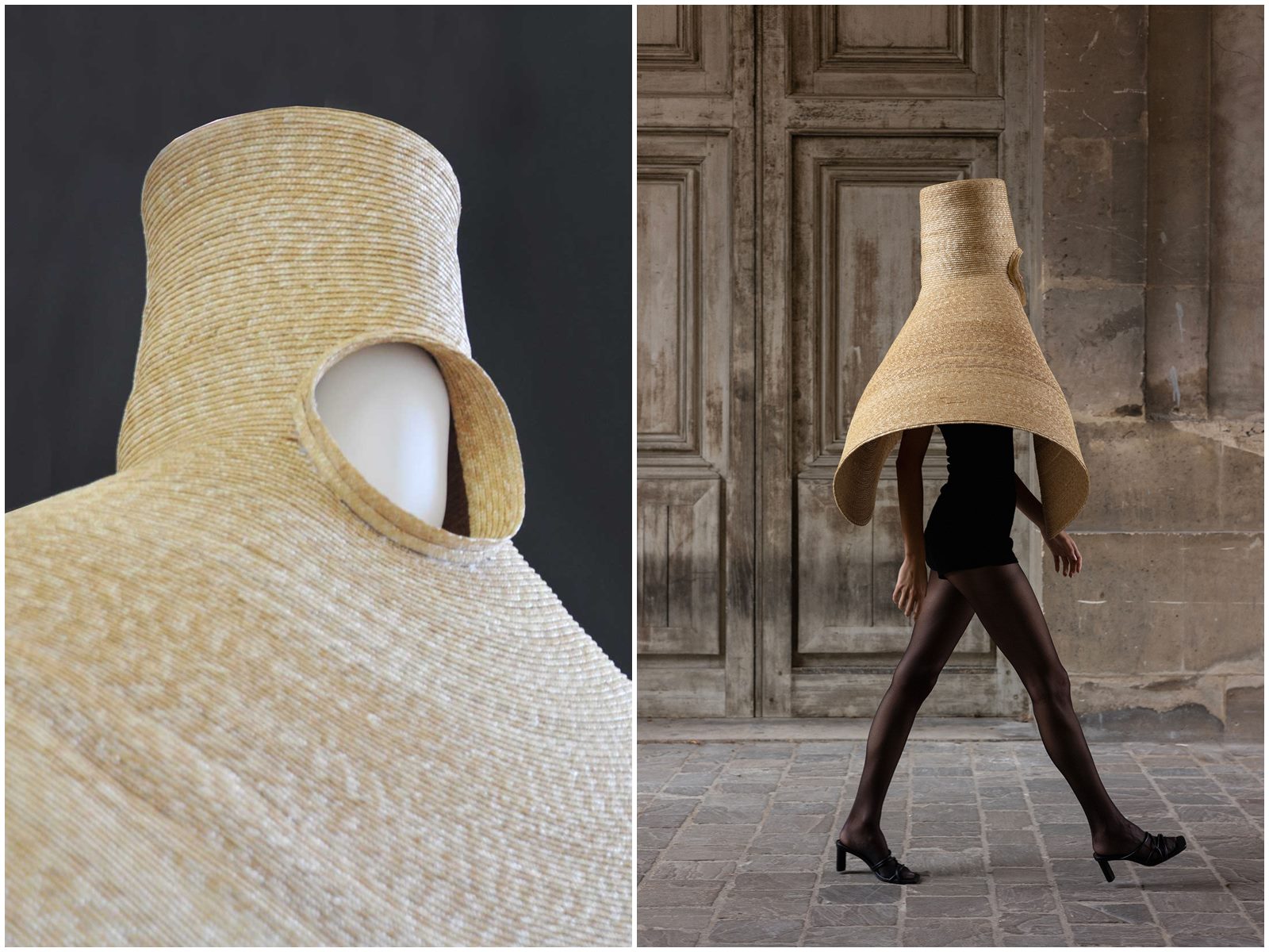 Chaude Couture 覆蓋了穿戴者的上半身,圓筒狀的帽型貼合頭部,卻一點也不笨重,然後它的防雨關鍵在於材料:整件雨衣是由手工編織的稻草製成,纖維具有天然的防水性,雨水會順著外層流下,不會滲進衣服裡。這件雨衣由 Giulia Pozzi 與 Mirko Andolina 所創立的 Fabulism 所設計,並找來熟練的工藝師,把稻草編成服飾結構,成果彷彿是傳統斗笠和現代外套的融合,既呼應前人智慧又時尚新潮。
