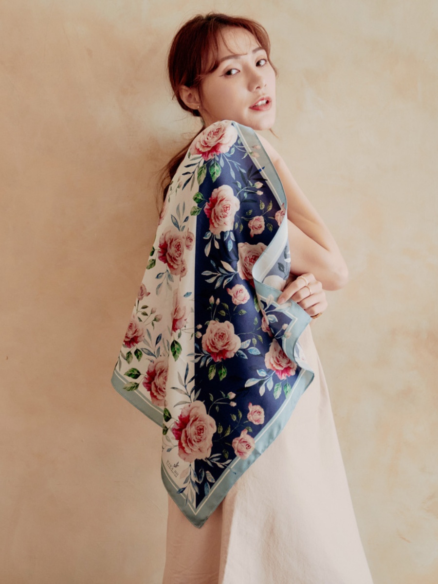 3. NINA HO ILLUSTRATION|Blue Leaf Rose Double-Sided Silk Scarf #藍葉玫瑰雙面真絲絲巾